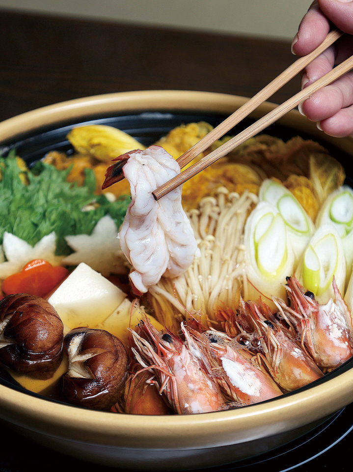 海老の身が大きく食べ応えがあり、濃厚な旨みのある出汁が特徴。出汁は北海道産の昆布、かつお節、さば節などに加え、隠し味としてくれぇ海老の頭の殻から出るエキスを使用し、濃厚で旨みのある出汁に仕上げている。具材はオレンジ白菜、ネギ、しいたけ、えのき、豆腐が入っており栄養満点で、新鮮なくれぇ海老をしゃぶしゃぶしながら食べる。大将の吉岡俊介さんがオススメする〆はうどん。お店の雰囲気も明るく家族連れでも安心して利用できるので是非訪れてみよう。