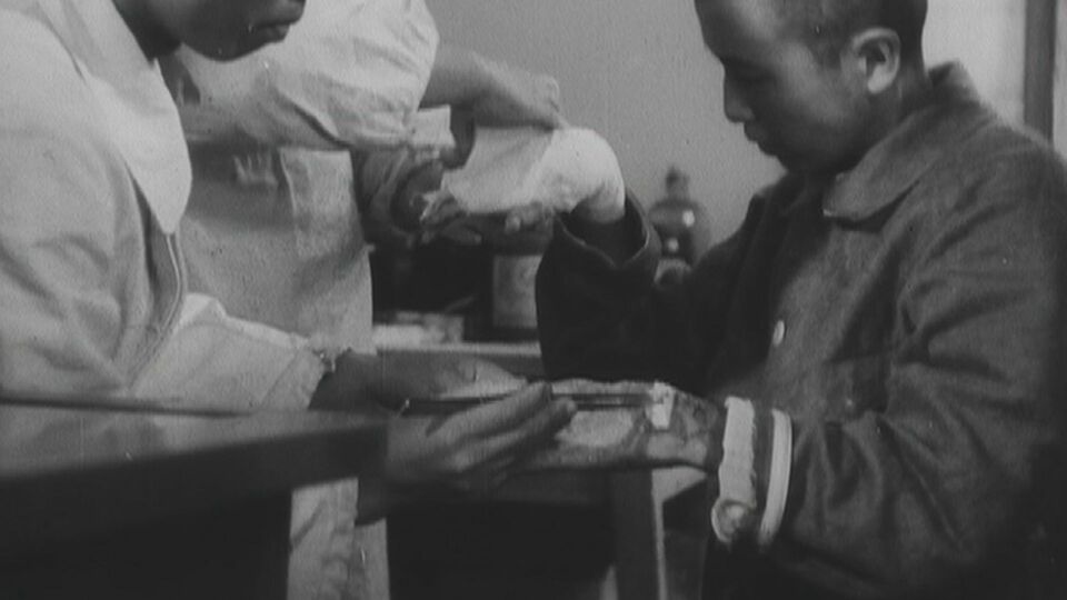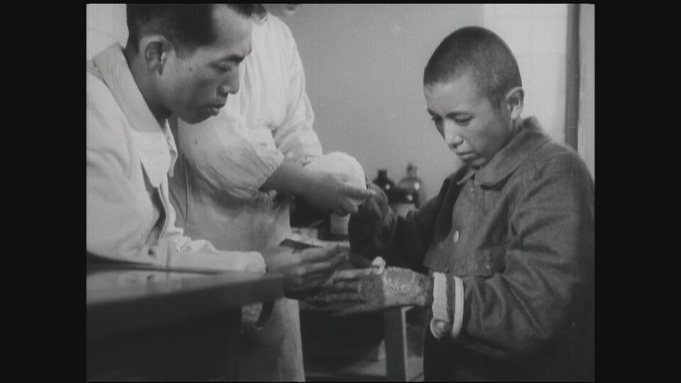 被爆から2か月後ほどたった1945年10月5日に撮影された映像に、日赤の皮膚科医だった愛之さんの姿がありました。診察を受ける男性は手にやけどをしています。同じ皮膚科医である息子の森田健司さんは、「2か月たってこの状態。相当深いやけどだと思う」と話します。