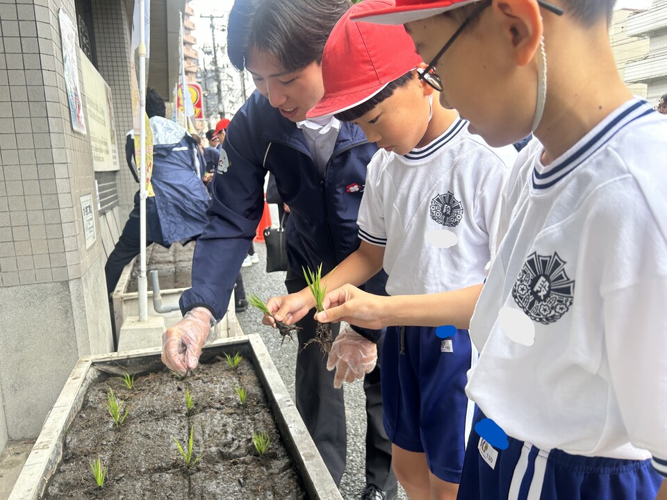 広島市南区松川町にある、食協株式会社の本社前で、段原小学校の5年生が田植え体験を行いました。