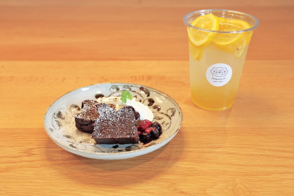 呉中央桟橋ターミナル内に位置する「さんばしや」で、常連のお客さんに人気の「ガトーショコラ」は、喜界島の黒砂糖を使用した重厚感のある濃厚な味わいが特徴。ベリーとこだわりの固めに仕上げた生クリームが添えられた一品。また、お店1番人気の「レモンソーダ(600円)」は、旬の時期には蒲刈産のレモンを使用し、はちみつと砂糖で丁寧に漬け込んだ自家製シロップで作られている。レモンの爽やかさと、ほのかに香るハチミツの優しい甘さが喉を潤す。
