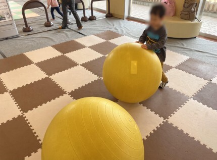 大きなバランスボールが4つ置いてあって大玉ころがしのように遊んだり、2人で向かい合って転がし合いをしました。