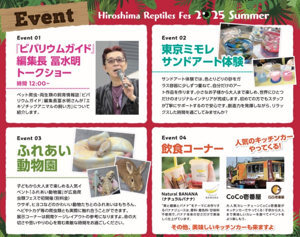 詳しくは「広島爬虫類フェス」ホームページをご覧ください。