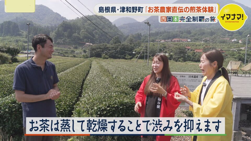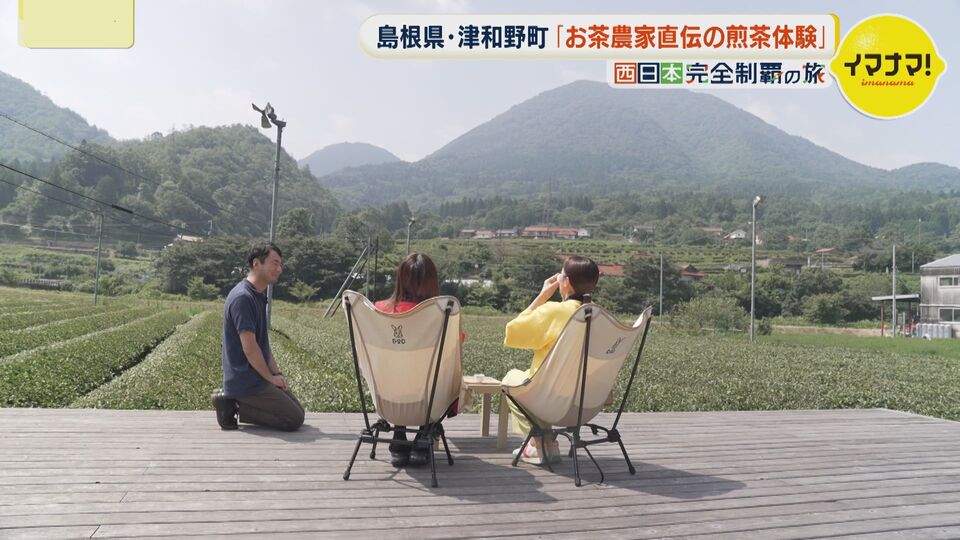 津和野旅2日目。2人の後ろに広がるのは茶畑。