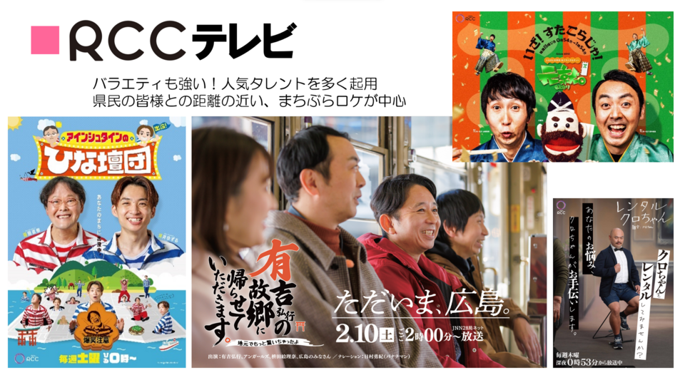 RCCは、地方局でありながらアンガールズさんやクロちゃんさんなど多くのタレントを起用してバラエティ番組を制作しています。