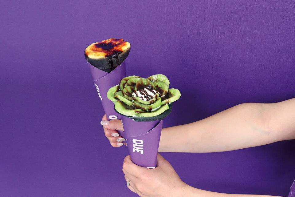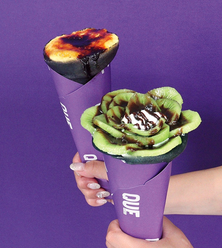 れんがどおりに店を構える「QUE crepe」は、ミネラル豊富な竹炭を使った黒いクレープ生地が特徴。生地は「モチモチ」か「パリパリ」が選べるほか、季節のフルーツトッピングやソース、クリームなどを選んでカスタマイズ可能。