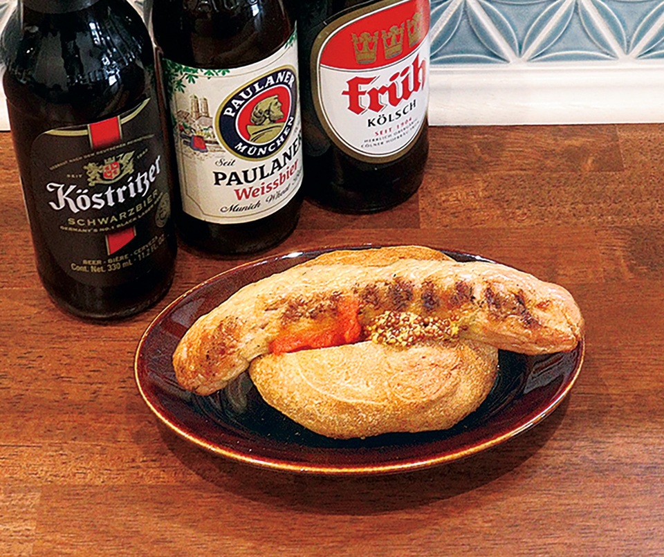 国産小麦全粒粉の自家製バンズ(パン)のほか、ザワークラウト(発酵キャベツ)、ケチャップ、マスタードも手作りだ。ホットドッグに合うドイツビール(700円)や自家製ジンジャーエール(350円)などドリンクも種類豊富。