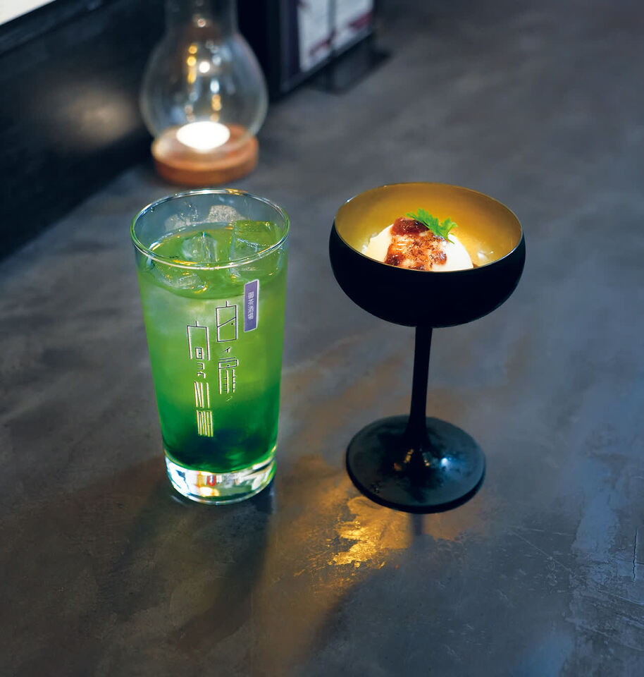 深夜にスイーツが楽しめるカジュアルバー。オススメの「NIWAの照葉樹林(700円)」は抹茶リキュールをベースにした人気のカクテルで、定番の烏龍茶だけでなく、煎茶やジャスミンティーなど、その日の気分に合わせて風味の変化を楽しめる一杯。