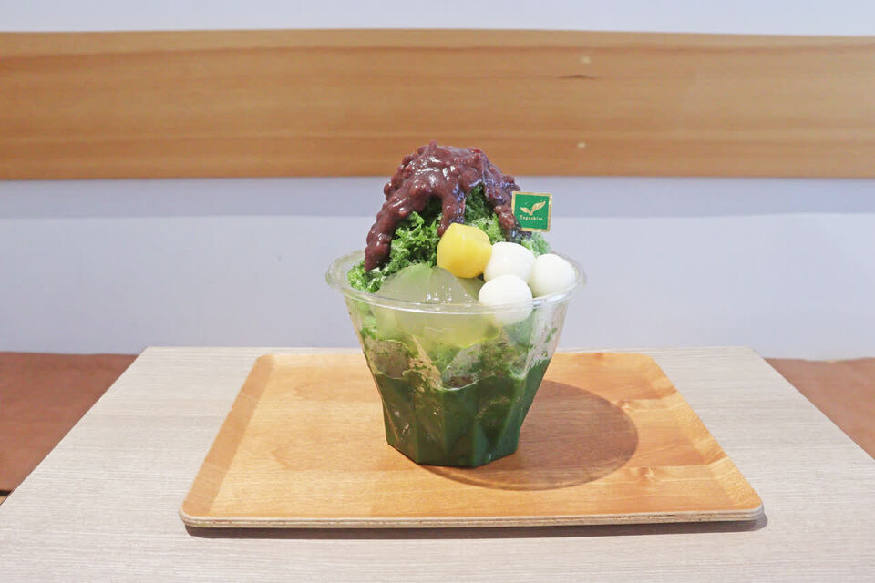 京都・宇治産高級抹茶の豊かな風味と、上品な甘味を堪能できる「老舗茶屋のかき氷 濃抹茶金時(1,320円)」が、夏季限定で登場。北海道十勝産小豆のあんこと白玉、本わらび粉のわらび餅、栗の甘露煮が添えられ、食べ進めるほどに食感や味わいが変化していく楽しみも。好みで「練乳(110円)」や「ミルクアイスクリーム(165円)」を追加すれば、より抹茶の風味が引き立つのでオススメ。連日の暑さを心地よくクールダウンしてくれる。