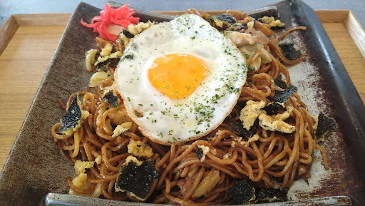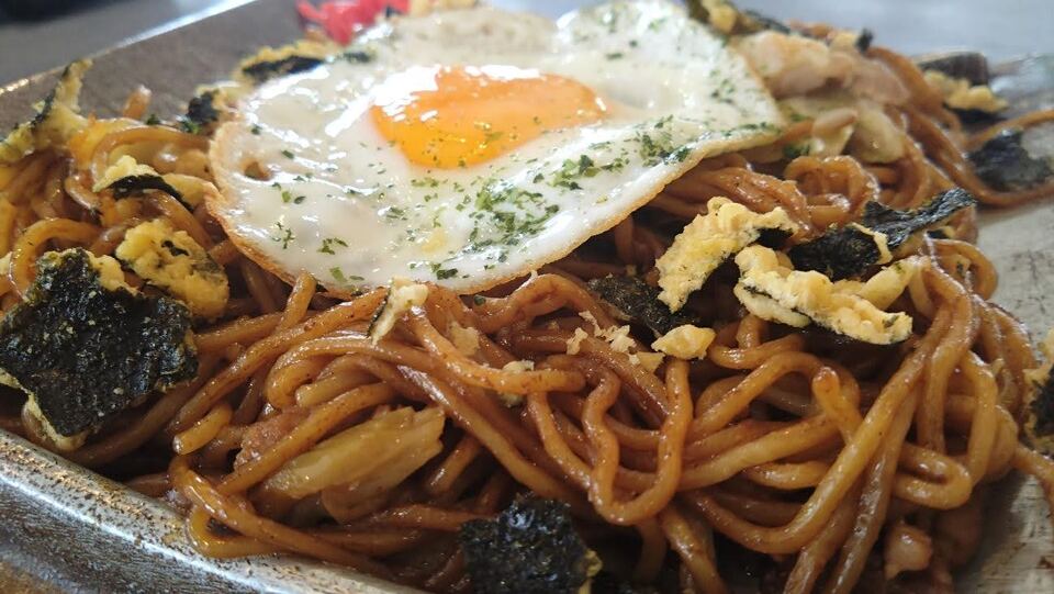 瓦風の鉄板で提供される焼きそばの上にカリカリ海苔天ぷら!