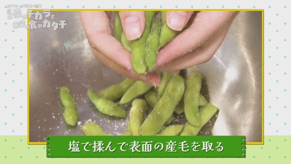 ② 塩で揉んで、エダマメの表面の産毛を取ります。