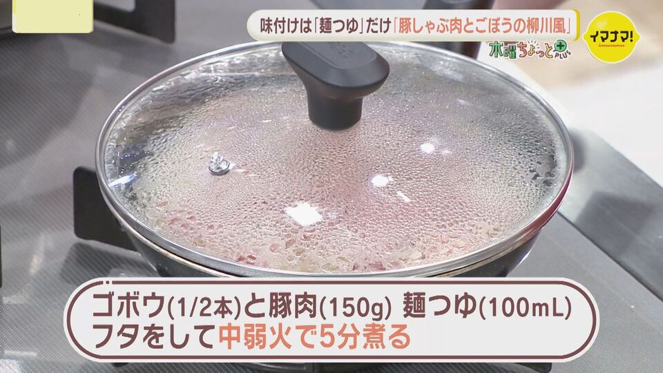 ① 鍋に、ゴボウ(1/2本)と豚肉しゃぶしゃぶ用(150g)、麺つゆ(100ml)を入れ、中弱火で5分 ほど煮ます。