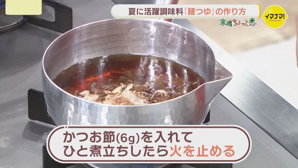 ⑤ かつおぶし(6g)を入れて、ひと煮立ち したら火を止め、そのまま冷まします。