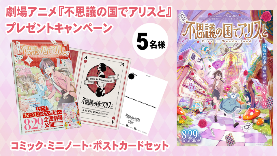 そんな映画『不思議の国でアリスと -Dive in Wonderland-』のコミックス1巻・ミニノート・ポストカードのセットを5名様にプレゼント!ご応募はこちらから!応募締め切りは9月12日です。ぜひご応募ください!