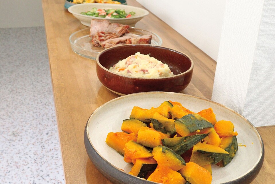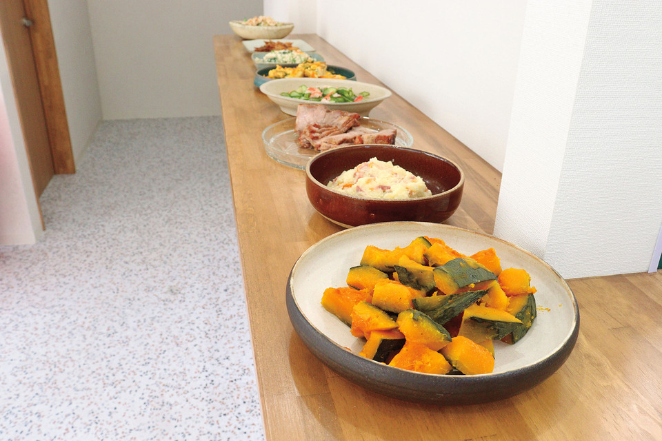 塩麹や生姜麹、醤油麹などの発酵調味料を使い、旬の野菜を取り入れた手作りのお惣菜が8~10種類並ぶ。1パック400円で2種詰め合わせもOK。いろいろなお惣菜が味わえる「惣菜セット(500~800円)」も販売。しゅうまいや唐揚げ、自家製チャーシューなど、ボリュームのある主菜も人気が高い。「米粉クッキー(200円)」や「餅ケーキ(300円)」などのスイーツも店内で製造。店先に漂う甘い香りに惹かれて訪れる人も多い。