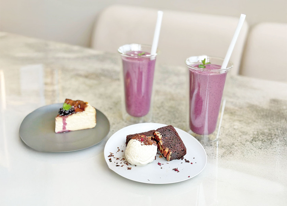 「自家製チョコブラウニー(700 円)」と「スムージー(800 円)」。