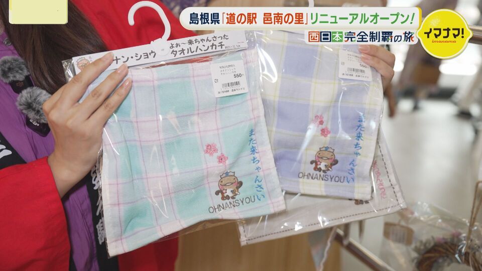 邑南町のゆるキャラ「オオナンショウ」の刺繡が入ったタオルハンカチはお土産にも最適。
