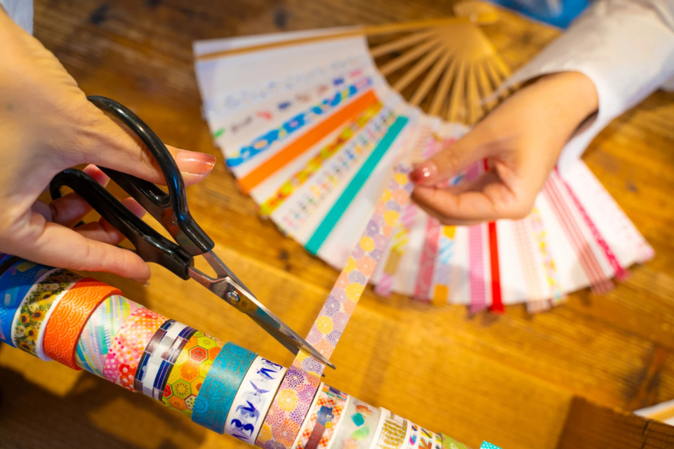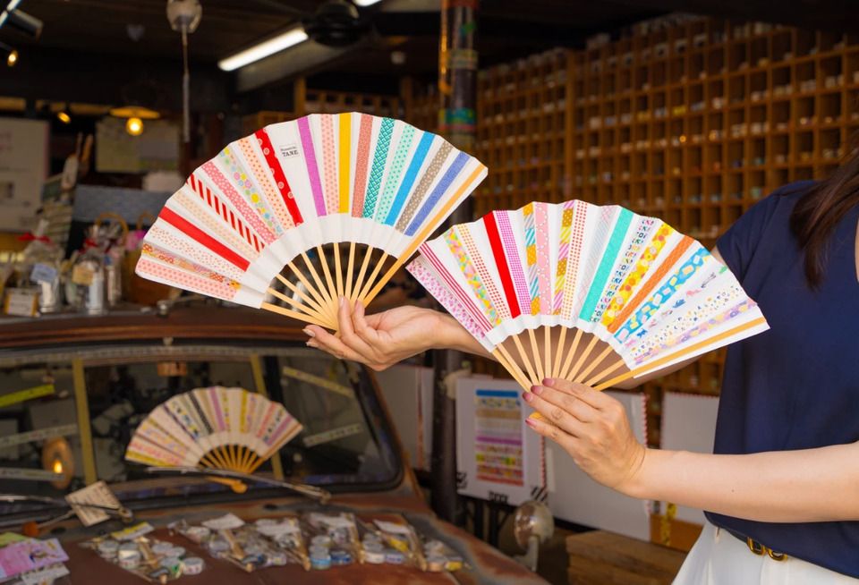 ここでは倉敷が本社のカモ井加工紙のマスキングテープ「mt」を使ったワークショップが体験できます。今回はオリジナル扇子デコレーションに挑戦しました!約40種類ものテープの中から20種類を選んで、扇子の面にぺたぺた…配色を考えながら貼り付けていきます。
