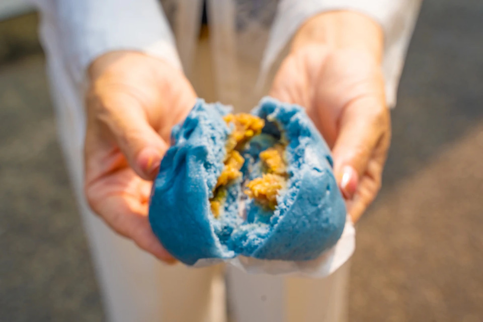 児島産デニム製品を販売する店が立ち並ぶ人気スポット「倉敷デニムストリート」で見つけたのが、こちらの青いデニムまん!青いソフトクリームも人気で、フォトスポットで撮影をする海外からの観光客もいっぱい。