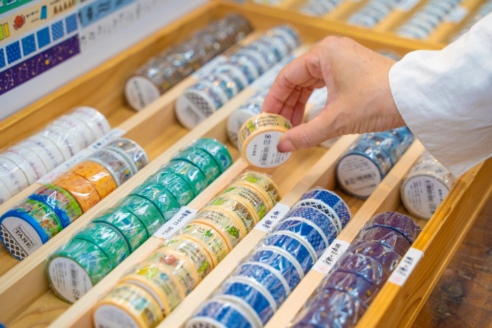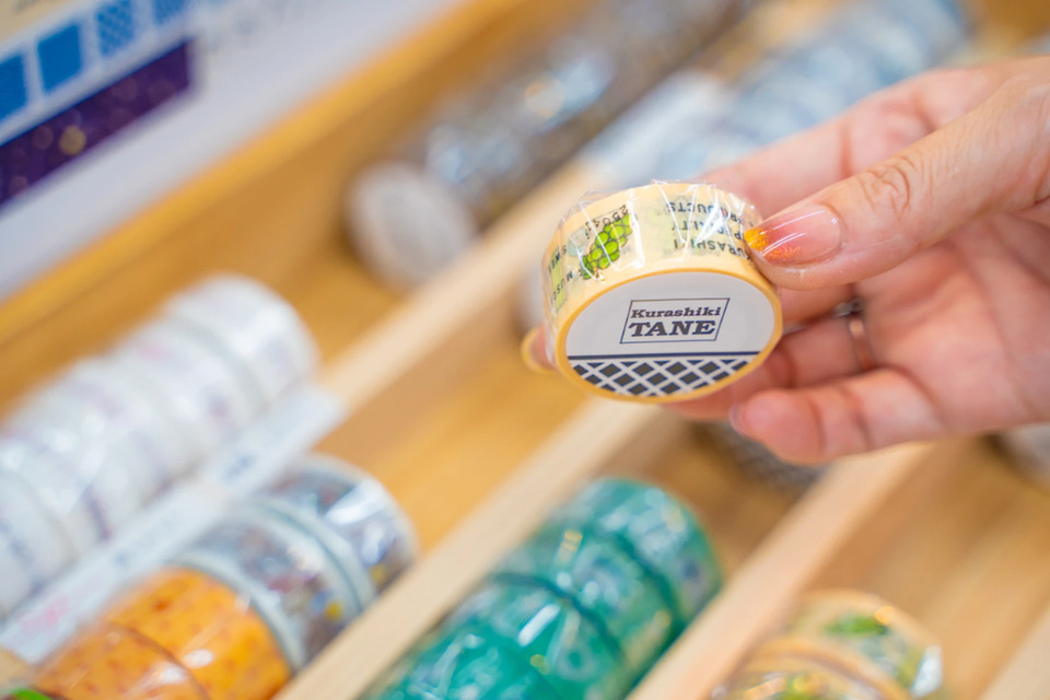 店内にはmtのマスキングテープ1,200種類以上ずらり! 圧倒的な品揃えに驚きます。オリジナル商品には、美観地区の風景やジーンズ、岡山ならではの果物柄などがありお土産にも人気です。