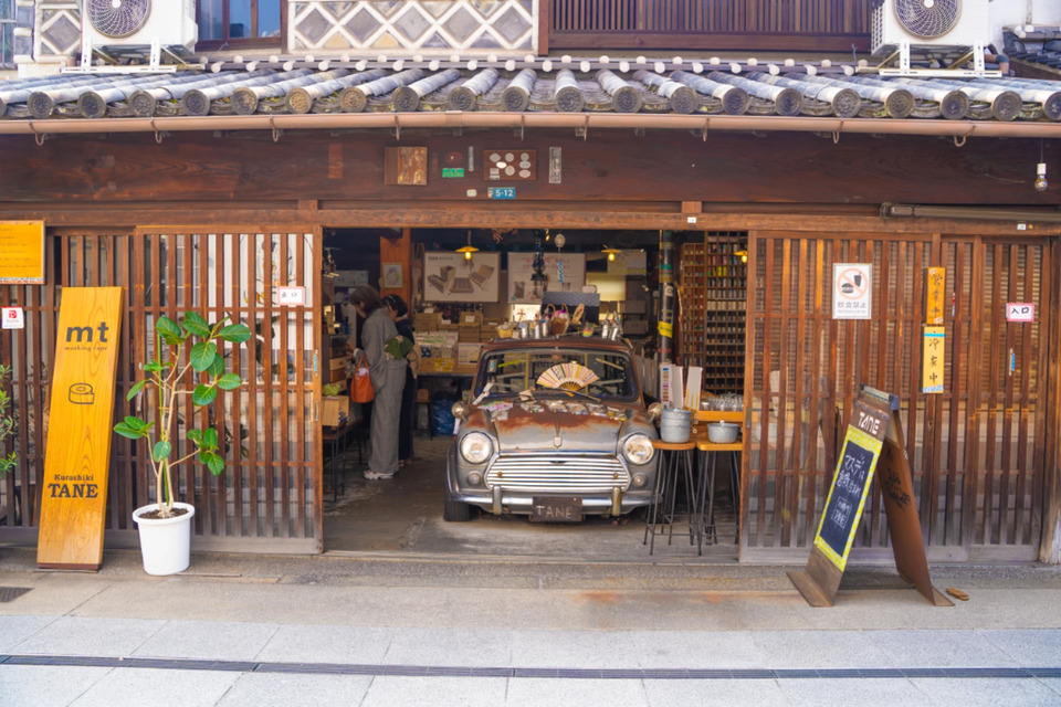 倉敷市はマスキングテープの発祥の地として知られているマステの聖地。倉敷川沿いから一本裏通りへ入った筋で、店頭の古いミニクーパーが目を引くマスキングテープのお店TANEを見つけました。