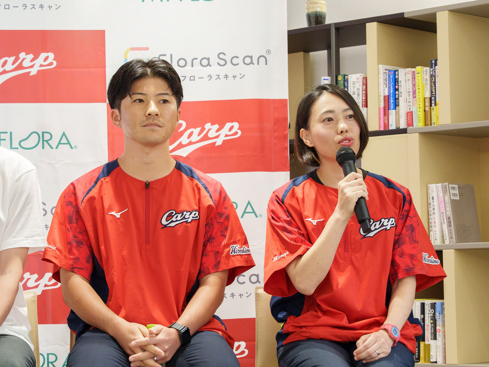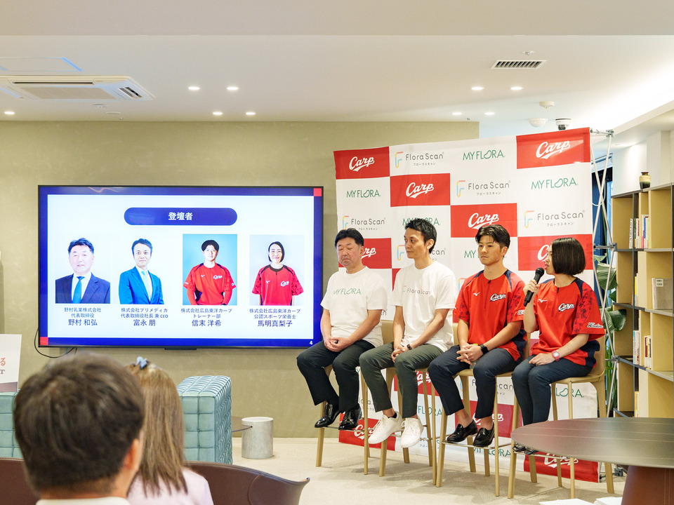 会見には、野村乳業 代表取締役の野村和弘さん、プリメディカ 代表取締役の富永朋さん、広島東洋カープからはトレーナーの信末洋希さん、栄養士の馬明真梨子さんが登壇しました。