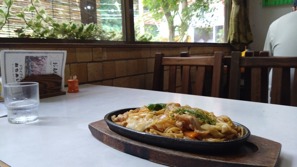爽やかな山の風が心地よい昭和な店内で提供される焼きそば…アツアツ鉄板で提供。