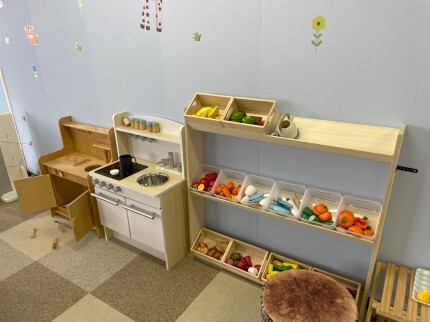 キッチンコーナーには木製のたべものおもちゃがたくさん。