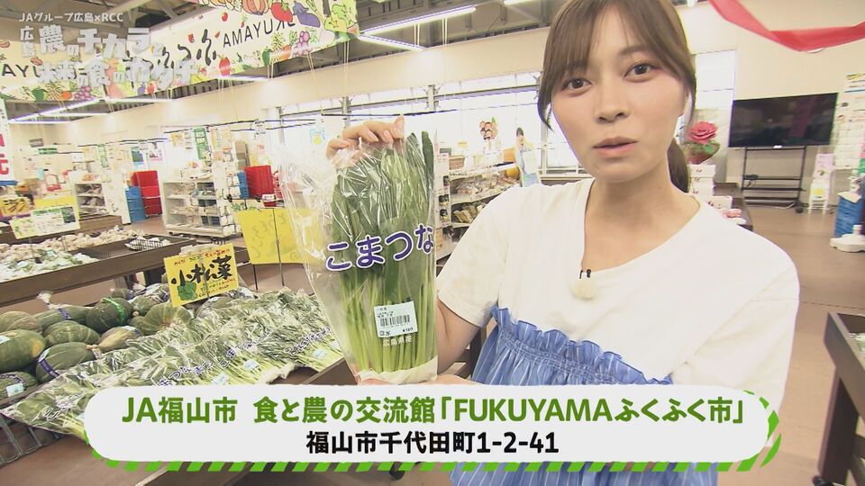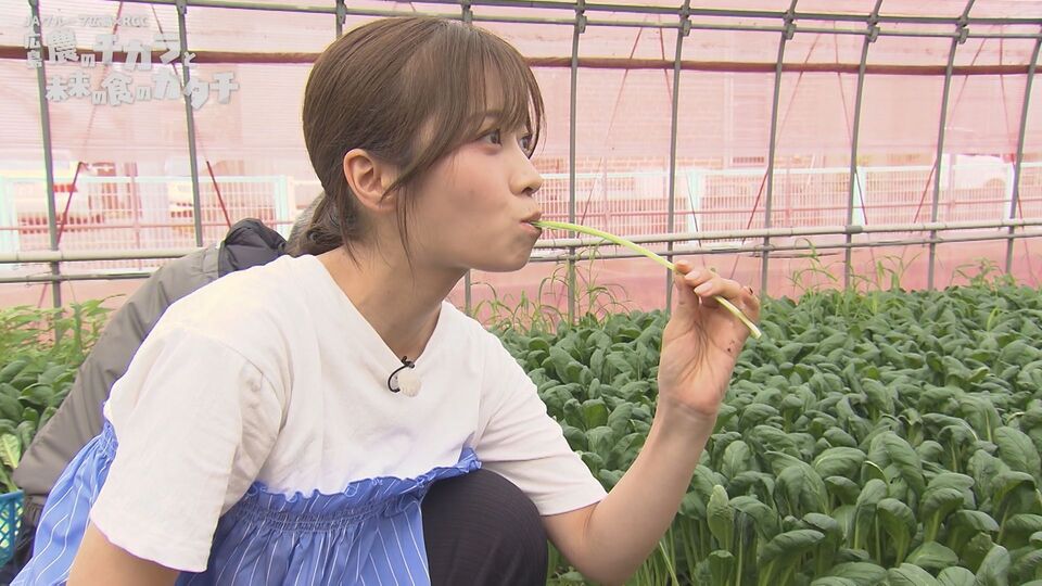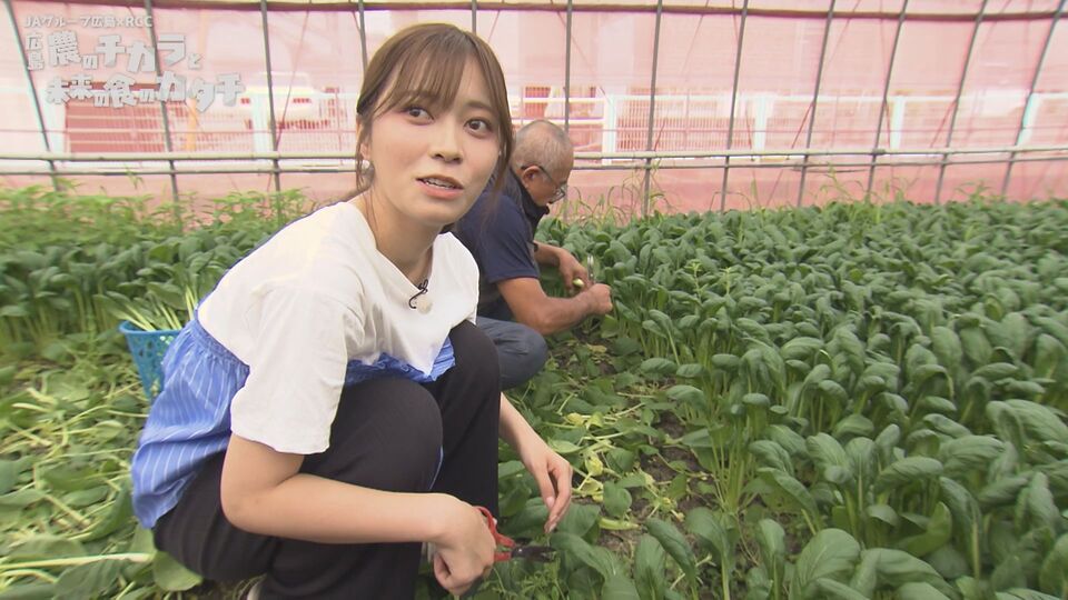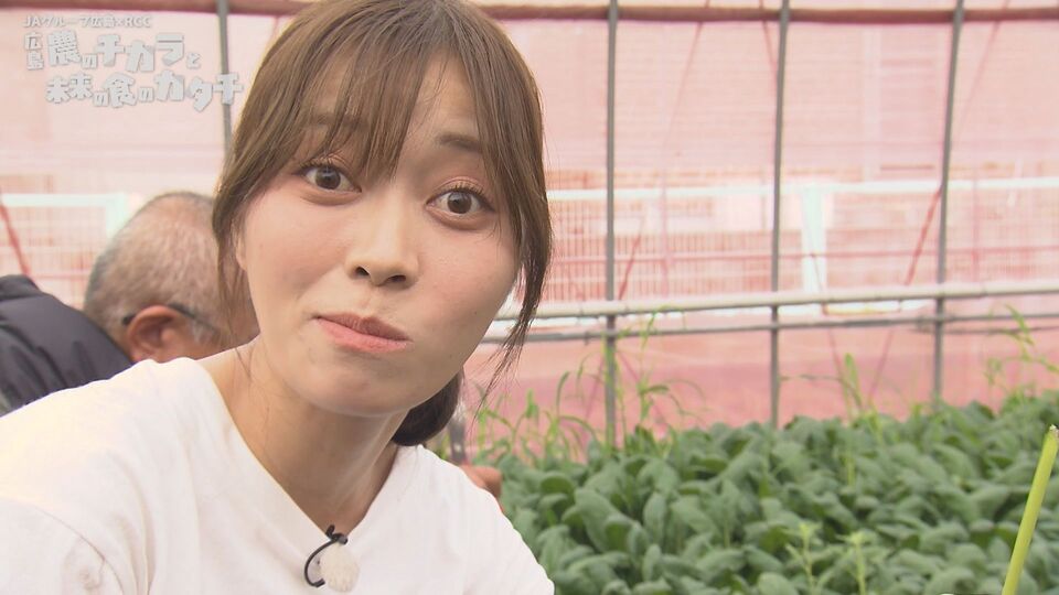 前回に続いて、JA福山市 食と農の交流館「FUKUYAMAふくふく市」 で出荷量No.1🥇猪原正章さんのコマツナ畑🥬に潜入中のRCC 楠本麗奈アナウンサー。
