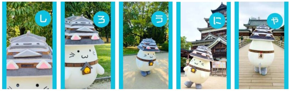 チャームポイントは広島城天守の比翼千鳥破風にみせかけた耳と、下見板張り風の首輪。
