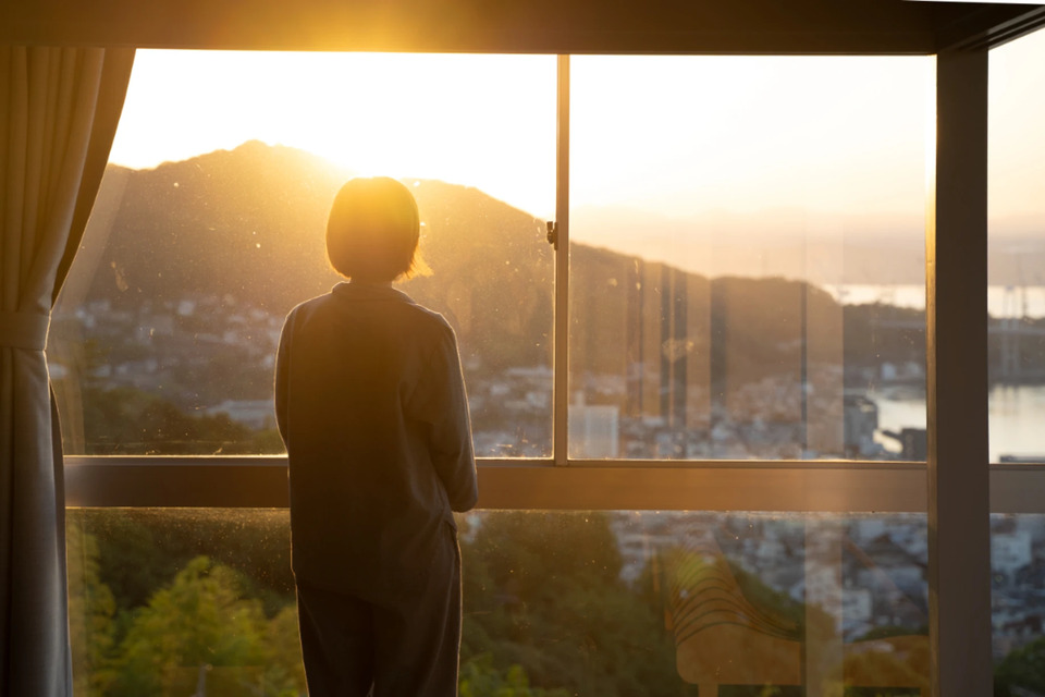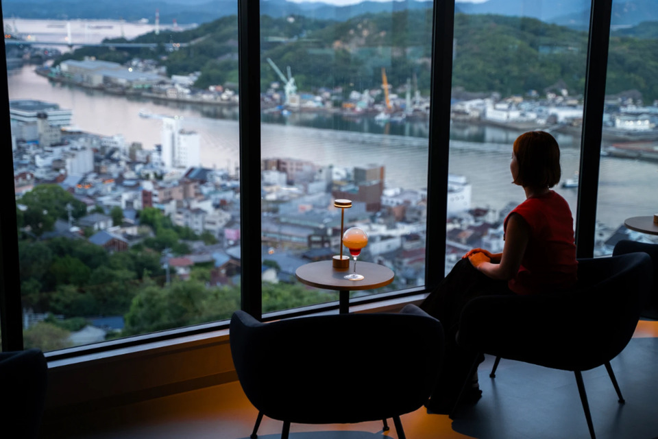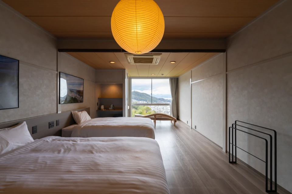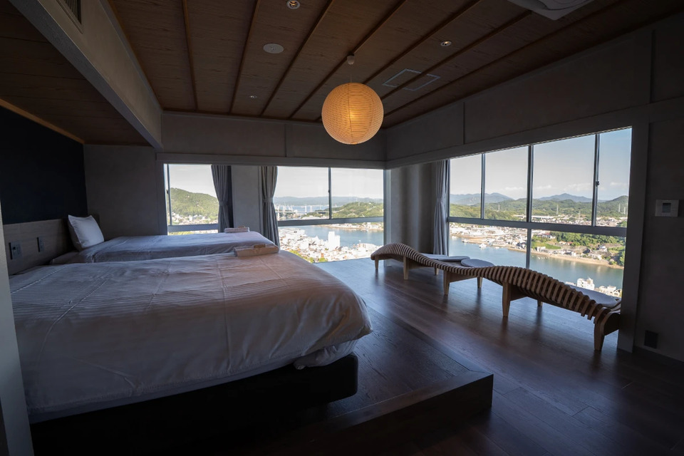 大人の女子旅や記念日旅行に泊まりたい!大きな開口部からは尾道の街並みがよく見える。/スタンダードツインルーム