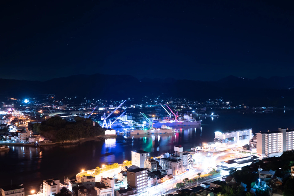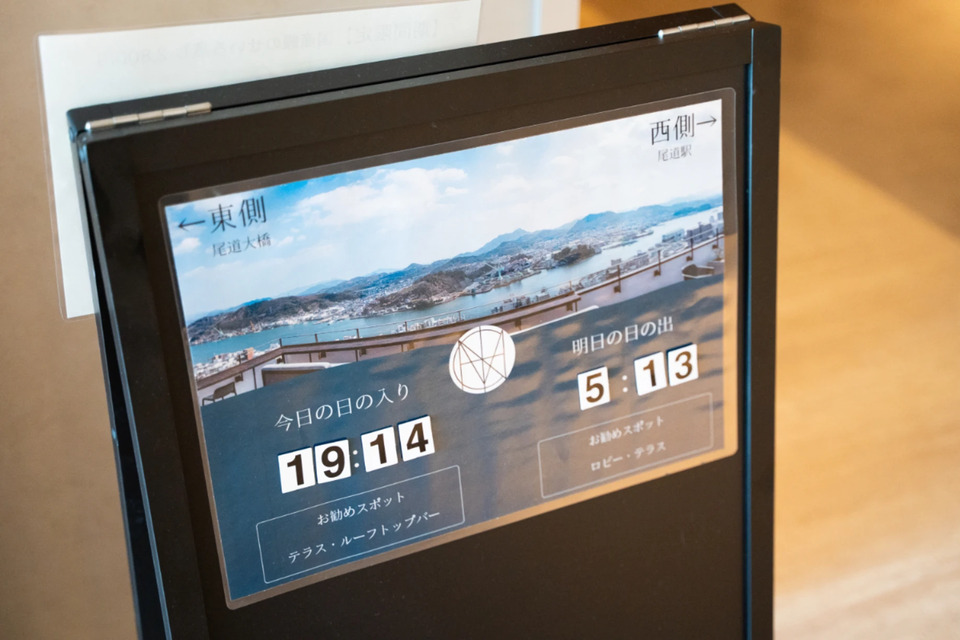 夜は港町の灯りが海にゆらめき幻想的。翌朝カーテンを開けると、尾道水道に差し込む朝日が町も海もやさしく照らし、ここでしか見られない絶景が広がっていました。日の出時刻はロビーで案内されています。