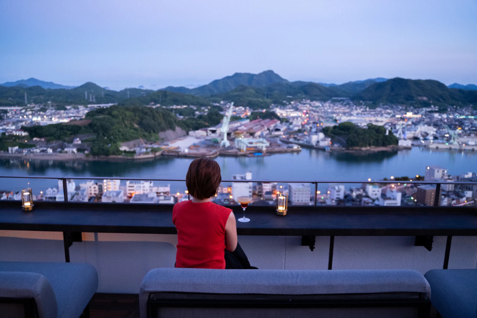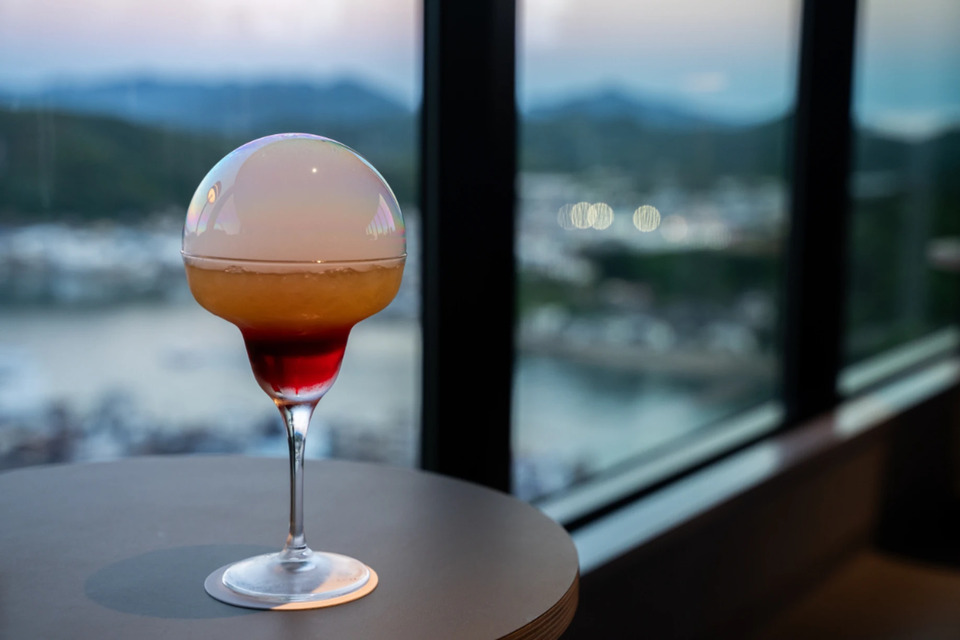 宿泊者以外も利用できるルーフトップバーは秘密にしておきたいくらいの絶景スポット。昼から夜へと移りゆく景色を眺めながら味わう一杯は格別です。おすすめはノンアルコールカクテル「サンセット」。淡いオレンジ色のドリンクの上のバブルがフォトジェニック。テラスでも店内でも夜景を堪能できるのでお好きな空間で満喫して。他に、宿泊者には「夜泣きラーメン」のサービスもあるのでぜひ。
