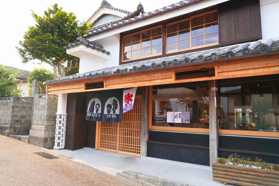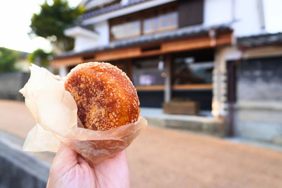 白壁と格子戸が連なる風景の一角にあるのが、人気のお店「あがるどーなつ/うだつぱん」。