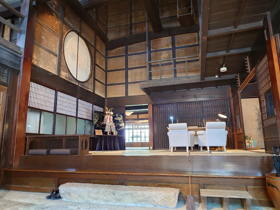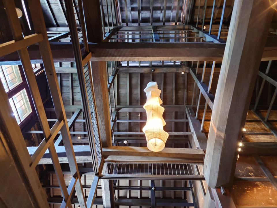 旧木村酒造場を改修したフロント棟の高い天井。立派な梁は圧巻!!