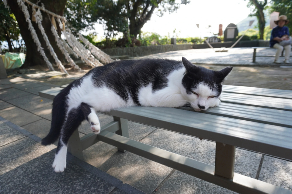 6匹の神社猫たちは、夜は社務所で過ごし、朝になると外へ出て縄張りをチェック!そのあとは神社の境内でゴロンとリラックス。ときには参拝者にすり寄って、愛嬌たっぷり。ここは、猫たちと、それを優しく見守る人々の温もりに包まれた場所なんです。