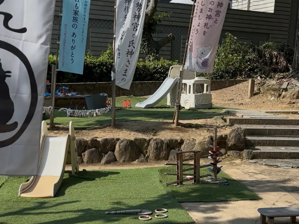 鳥居をくぐって中へ入ると、まず目に飛び込んでくるのは、なんと子ども用の遊具! 神主さんによると、「遊びに来た子どもたちが猫を追いかけないようにと遊具を置いたら、猫も子どもも、どちらも心地よく過ごせるようになったんですよ」とのこと。