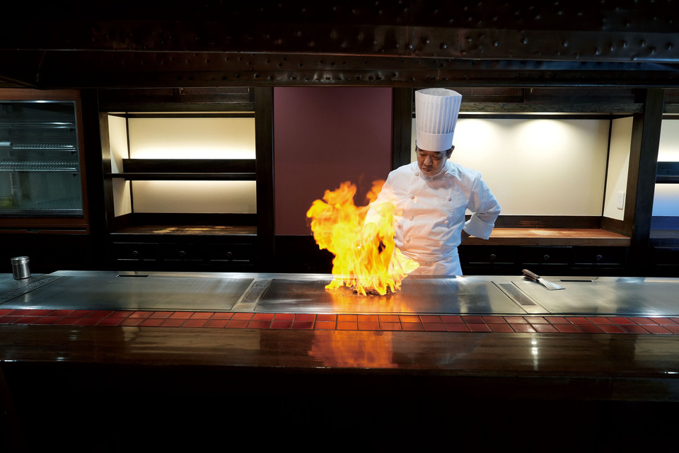 元オーナーから秘伝のレシピを受け継いだ高津仁志シェフのイチオシメニューは「プレミアコース(9,600円〜)」。鉄板席で極上ステーキのフランベを目の前で体験できる。
