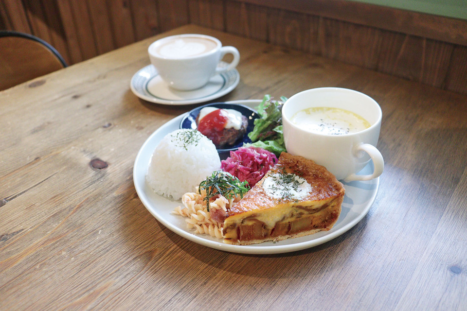 人気のランチ(ドリンク付き1,400円)は、生地から手作りする「キッシュプレートランチ」と、焼きたてバゲットの「フレンチトーストプレート」の2種。+600円で、バスクチーズケーキやプリンなど自家製デザートも楽しめる。