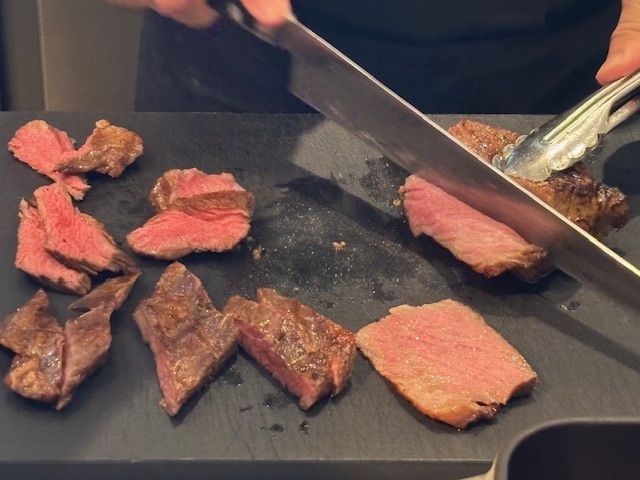 シェフが目の前で仕上げるステーキは、UmiShima Dining の自慢の一品。