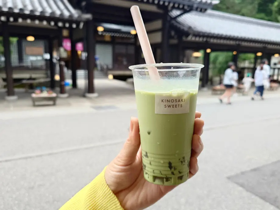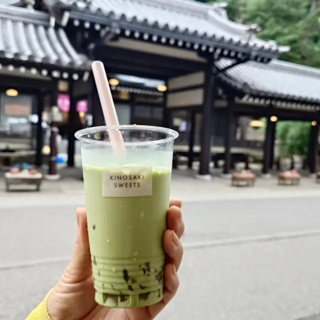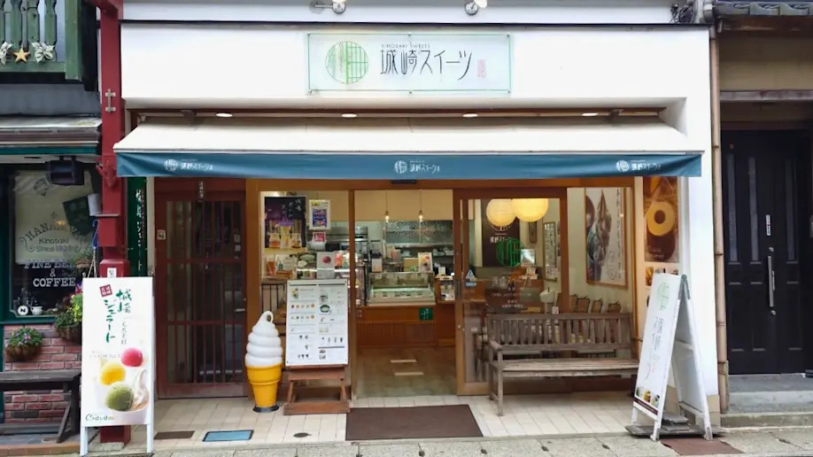 「御所の湯」の目の前にある「城崎スイーツ本店」では、ぷるぷる食感の「抹茶ミルクわらび餅」が評判。ドリンクも充実しており、店内でも外でも楽しめます。持ち帰りにも適した品がそろい、ちょっとしたお土産探しにもぴったりです。