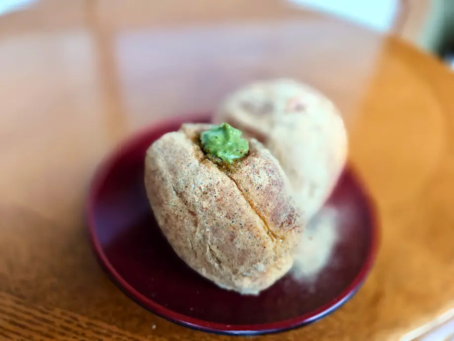 城崎温泉駅前通りにある「発酵餡菓うかわ」では、揚げパンが大人気。中に包んである発酵餡は、砂糖を使用せずに小豆と麹で作られていて、もっちりした皮と濃厚な餡&クリームが絶妙にマッチして一度食べたら忘れられない美味しさです!出来立てならではの香ばしさとふわふわの食感は、ここでしか味わえない感動の一品!