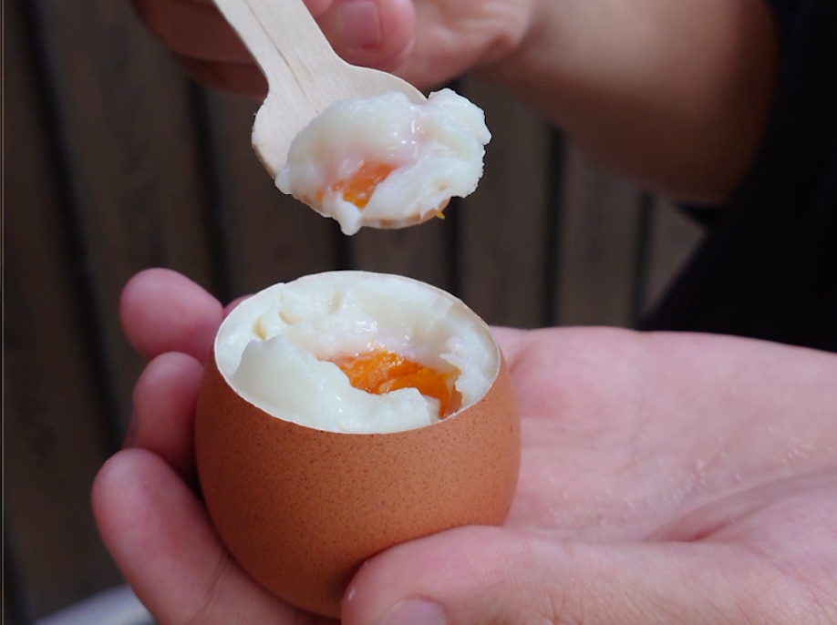 受付でネットに入った生卵を購入し、専用の湯壺に沈めて待つこと11〜13分。出来たてのとろとろ半熟卵を割り、塩をかけていただきます。