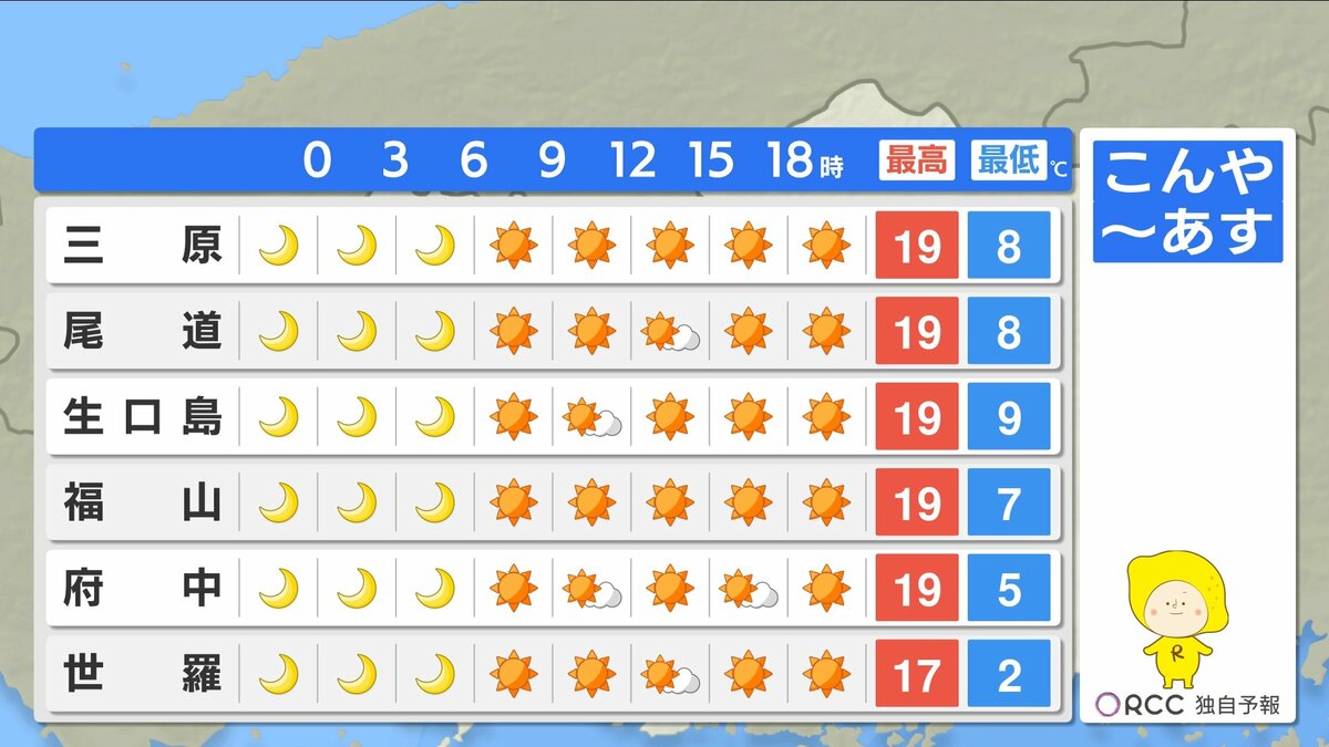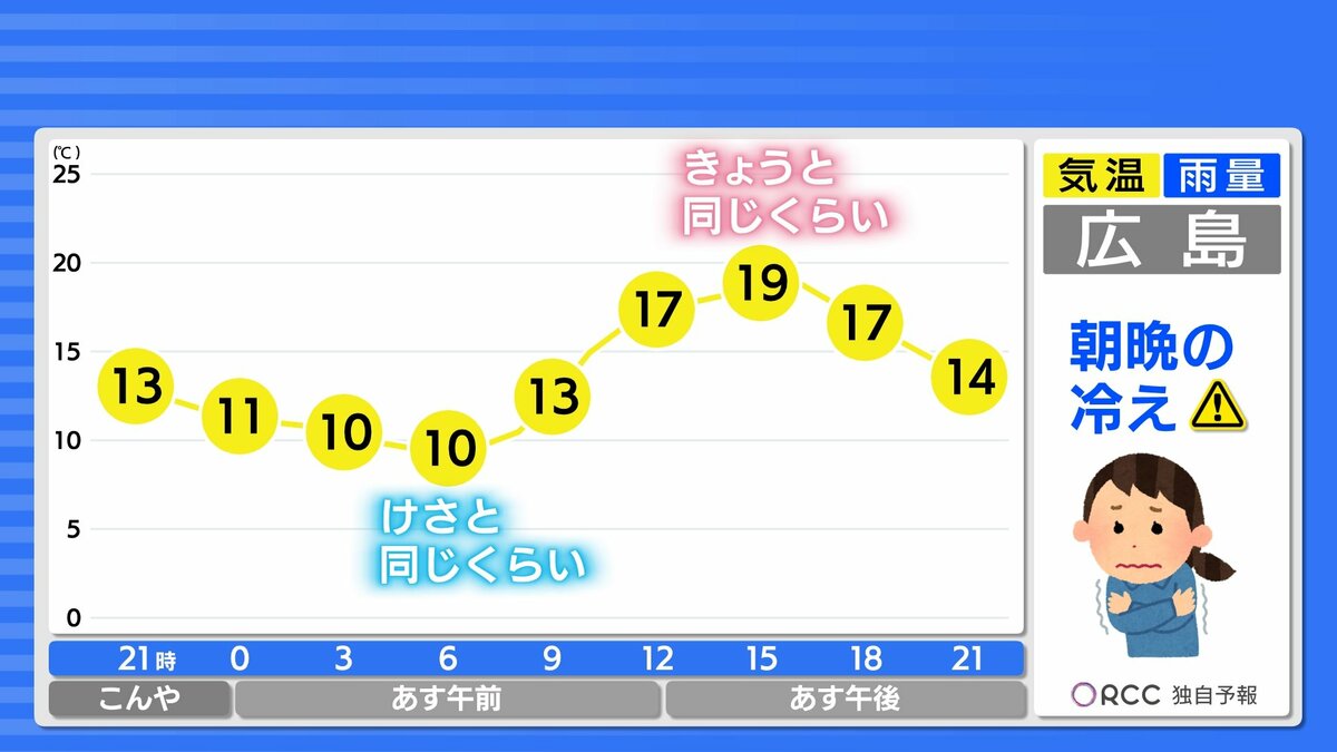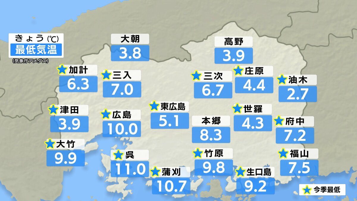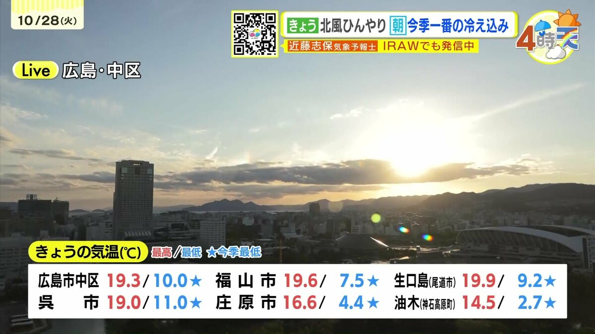 きょう28日(火)の広島県内は、日差しがあっても北風が冷たく感じられました。最高気温は、20℃に届いたところはなく、生口島で19.9℃、広島市中区で19.3℃でした。また、朝の冷え込みは今季1番のところが多くなっています。