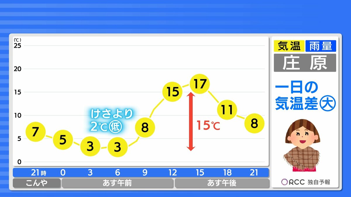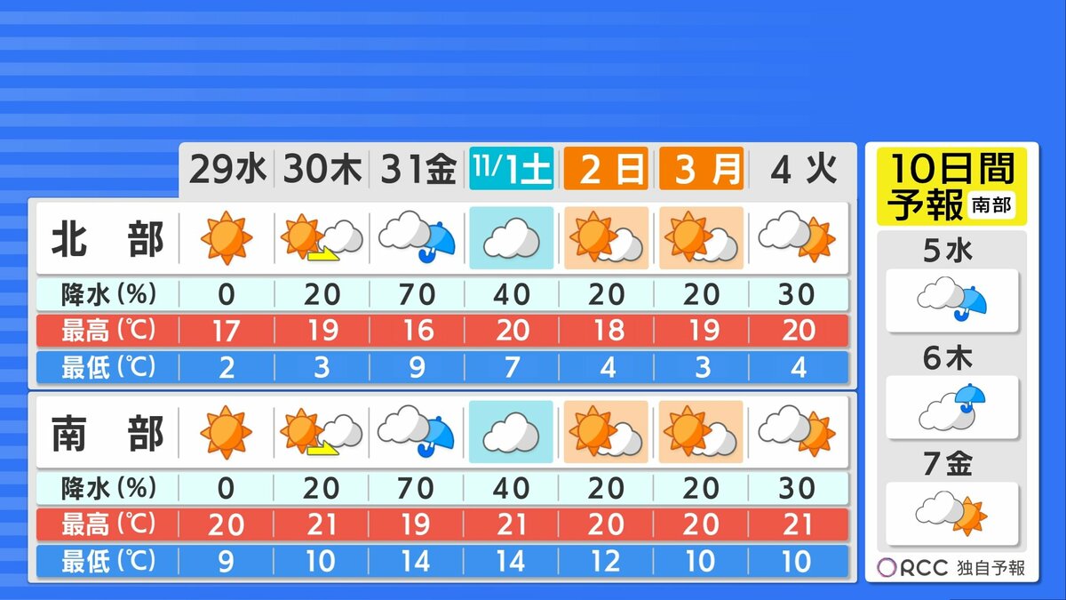 この先は、周期的に天気が変化する見込みです。あさってまで晴れますが、金曜は雨が降り、土曜はすっきりしない予想です。日曜と月曜は回復するでしょう。この時期、晴れると放射冷却が効くため、朝の冷え込みが強まります。1日の気温差も大きいのでご注意ください。