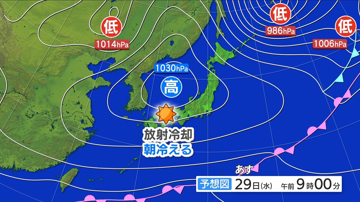 西高東低・冬型のような気圧配置が続いていますが、あすの朝には高気圧が東に進んで県内を覆う見込みです。そのため、晴れて風が弱まり、放射冷却がよく効くでしょう。けさよりも気温が低くなる予想です。北部や内陸部では、霜が降りるところがある見込みです。農作物の管理にご注意ください。日中もよく晴れて、崩れはないでしょう。