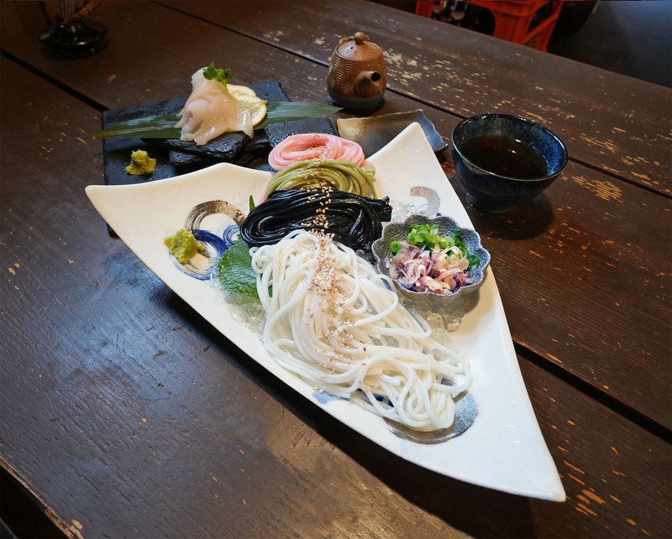 細麺でありながらもっちりとしたコシと喉越しの良い「五島うどん(700円〜)」がオススメ。梅・わかめ・竹すみ・白の4種類の麺はそれぞれの風味が楽しめる上、かけうどん・ざるうどんが選べる。さらに、イチオシのメニュー「アナゴの刺身(1,800円)」は、対馬アナゴを使用。上品な脂と濃厚な旨味、甘みが一線を画す一品だ。