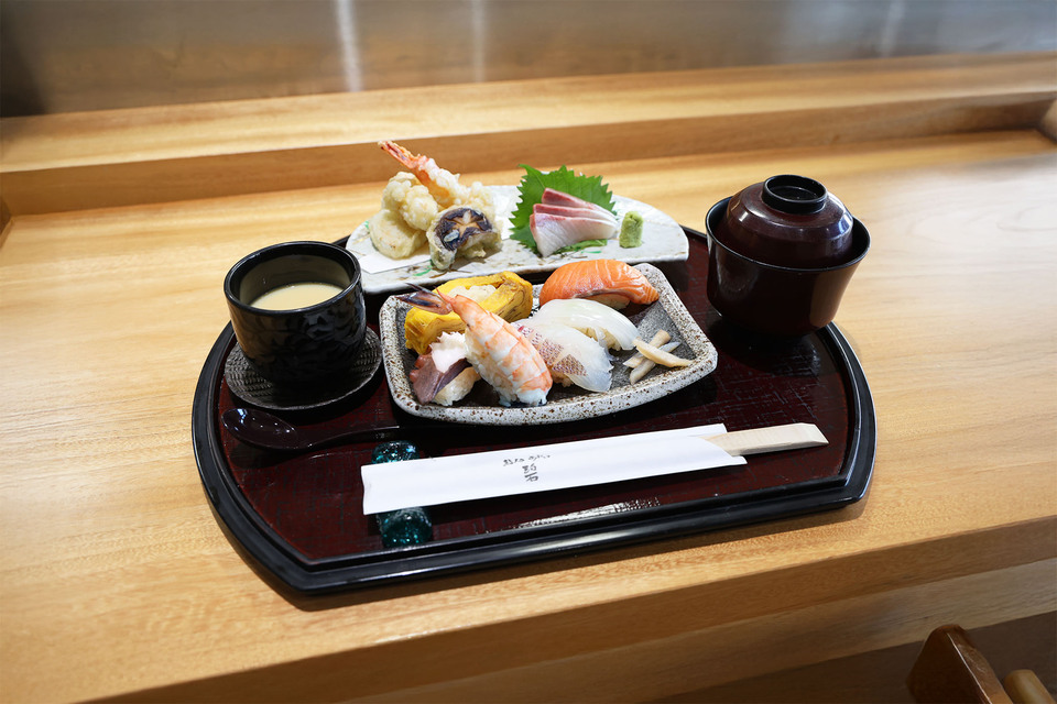 ランチは定食のみで、店主オススメの寿司6貫に、天ぷら、造り、茶碗蒸し、汁物、小鉢2種、甘味がセットになった「空御膳(3,500円)」がイチオシ。