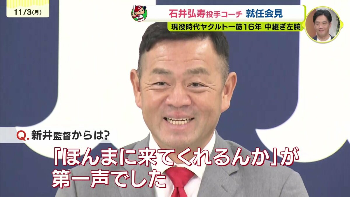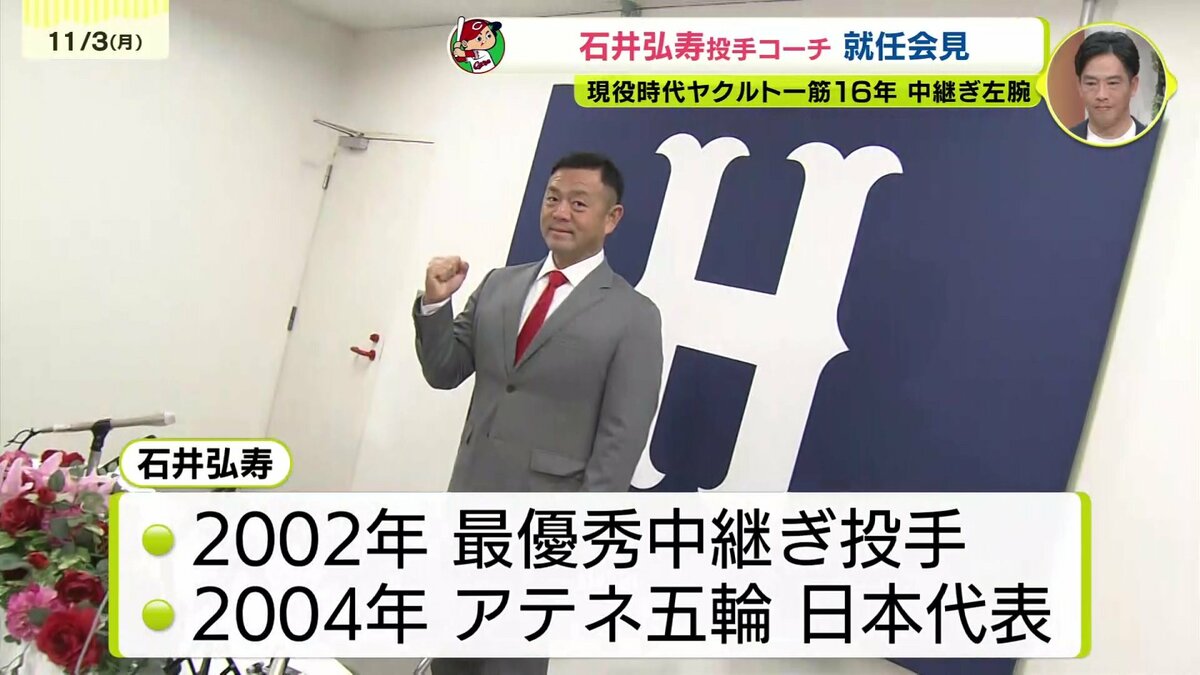 来シーズンからカープの投手コーチを務める石井弘寿コーチ。今日の就任会見でコーチ打診の舞台裏やカープ選手の印象を語りました。真っ赤なネクタイで登場したのは石井弘寿投手コーチ。石井コーチは現役時代ヤクルト一筋16年プレーし、2004年にはアテネオリンピック日本代表として銅メダルの獲得に貢献するなど、リリーフ左腕として活躍しました。