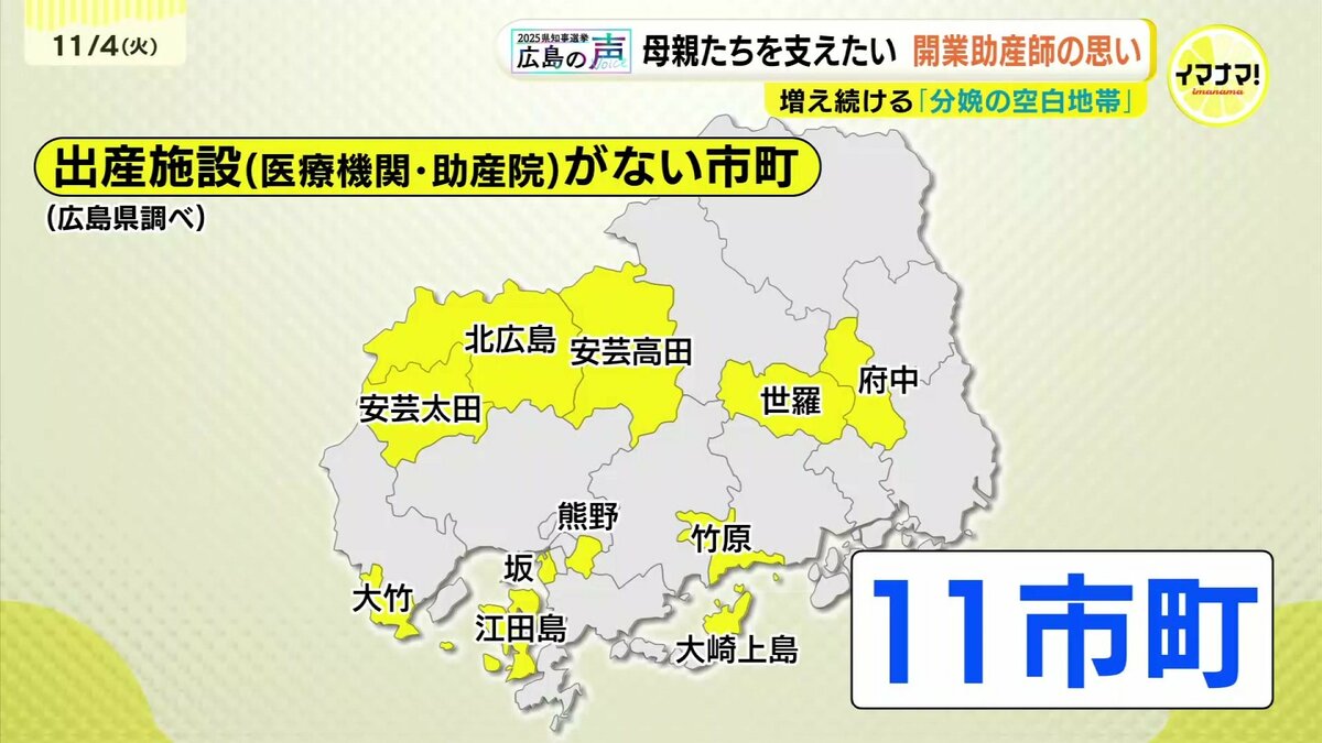 こちらをご覧下さい。現在、広島県内23市町のうち、出産できる医療機関や助産院がない自治体は約半数の11の市町にのぼります。