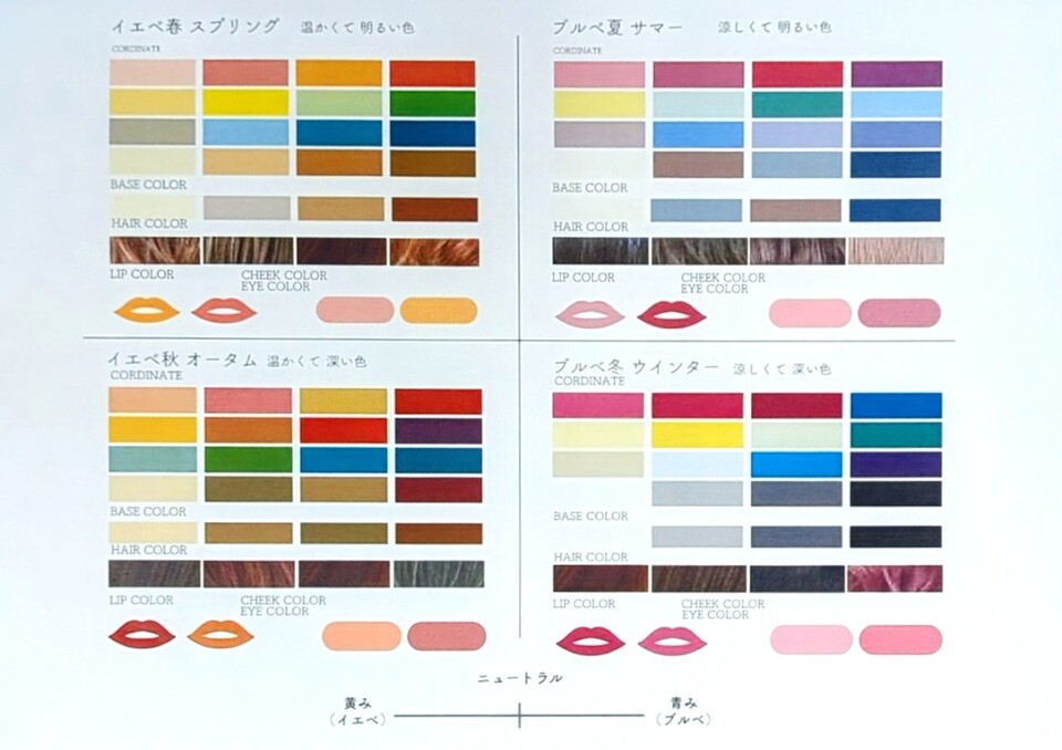 さらに、春・夏・秋・冬という4つの季節になぞらえて、イエベは春と秋、ブルべは夏と冬 の4つに分類していきます。